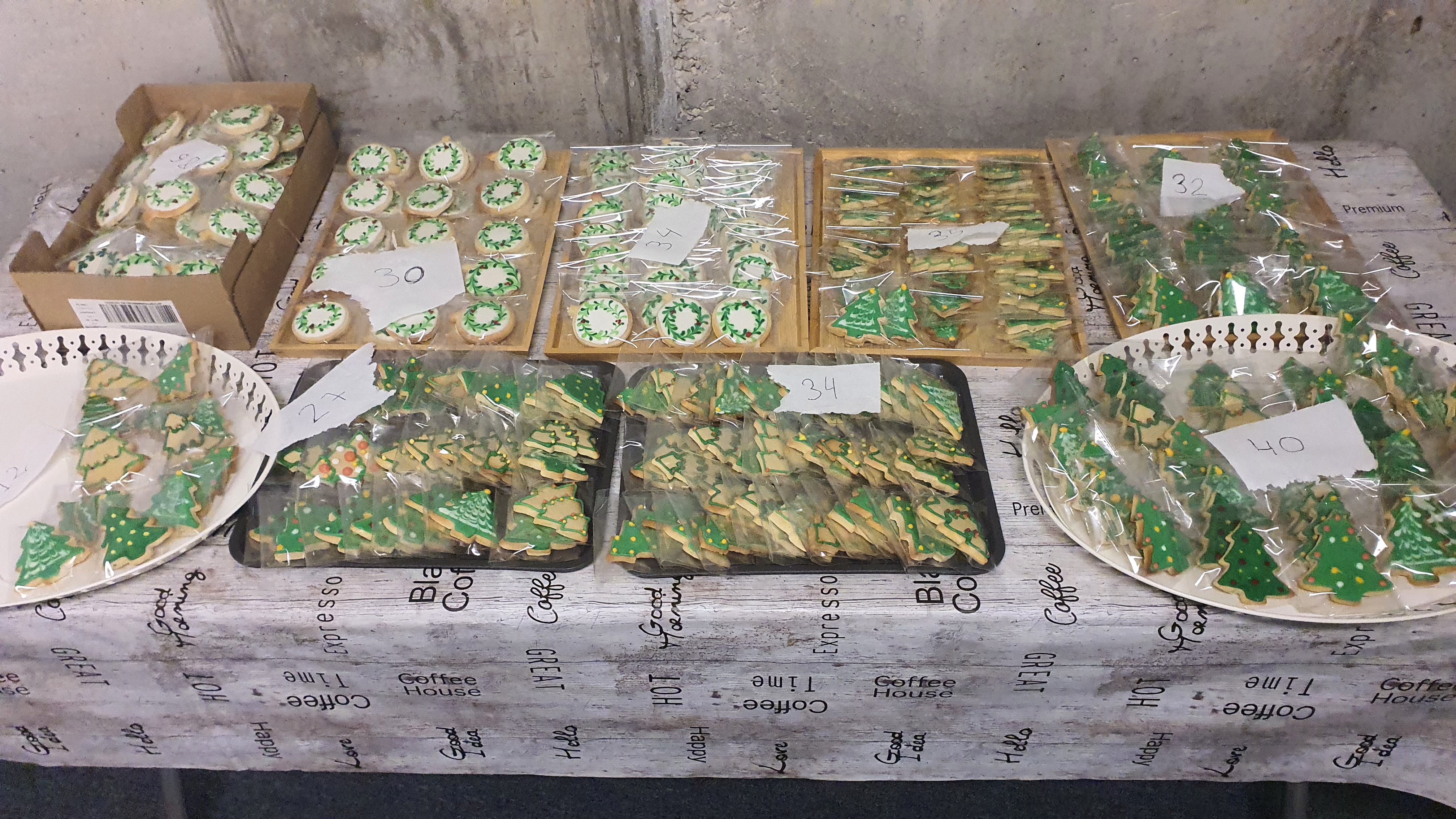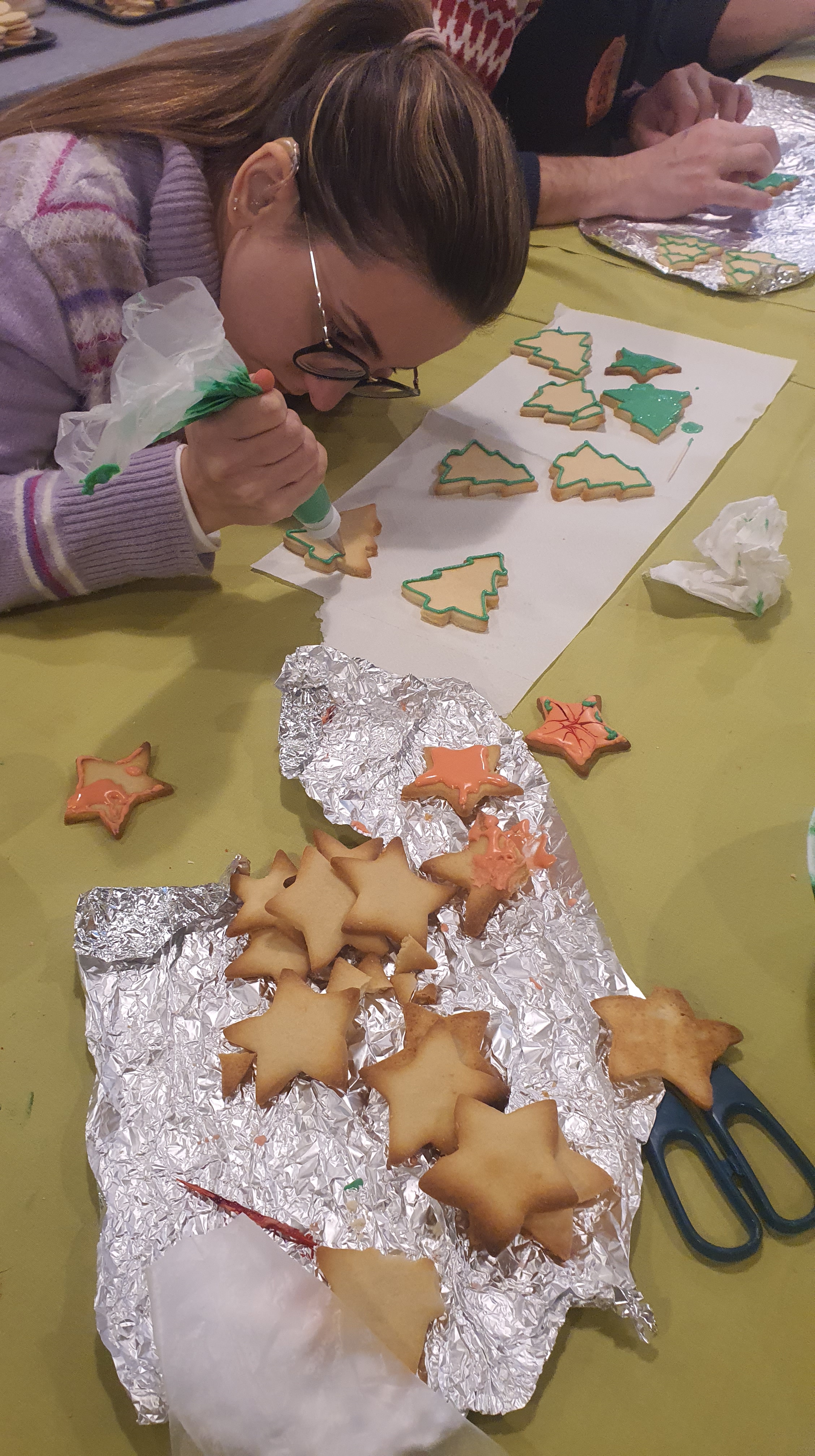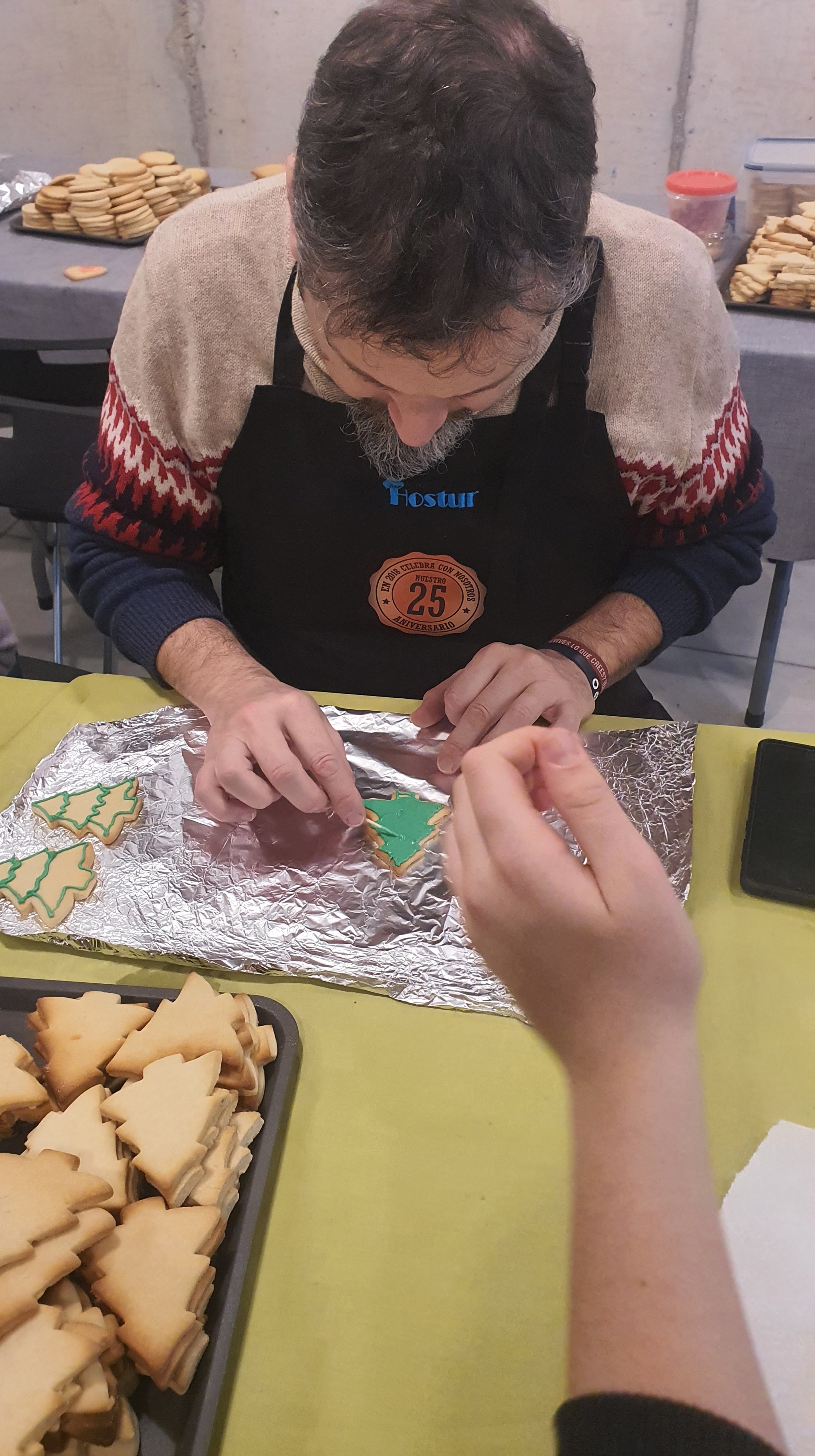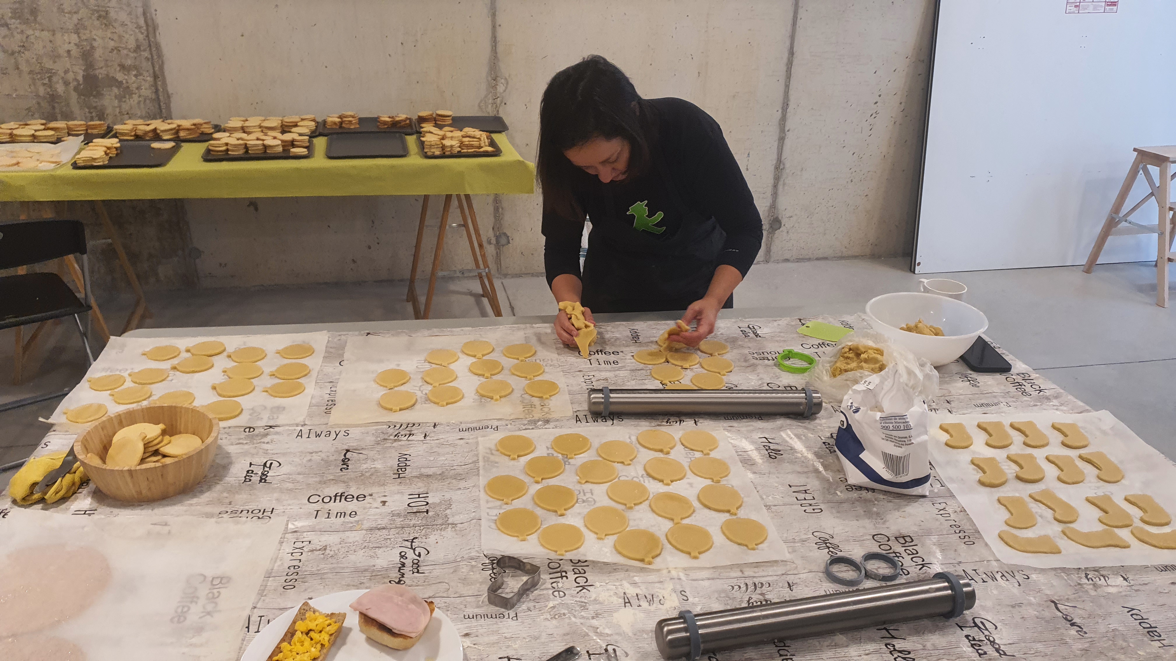 Entre el 4 y el 11 de diciembre varias personas se organizaron para primero comprar los ingredientes, luego preparar, dar forma y hornear la masa durante varias horas de más de un día. Las mangas y la decoración se hicieron presentes en una amena tarde de domingo después de la celebración, continuando al otro día. Más tarde se realizó el envasado en bolsas individuales de celofán, y se diseñó e imprimió la postal que acompañaría a las galletas. En ellas, además de la presentación y los buenos deseos, se indicaban los ingredientes de nuestras galletas artesanas para evitar problemas con las alergias: harina, mantequilla, huevo, azúcar, esencia de vainilla y colorantes alimenticios.