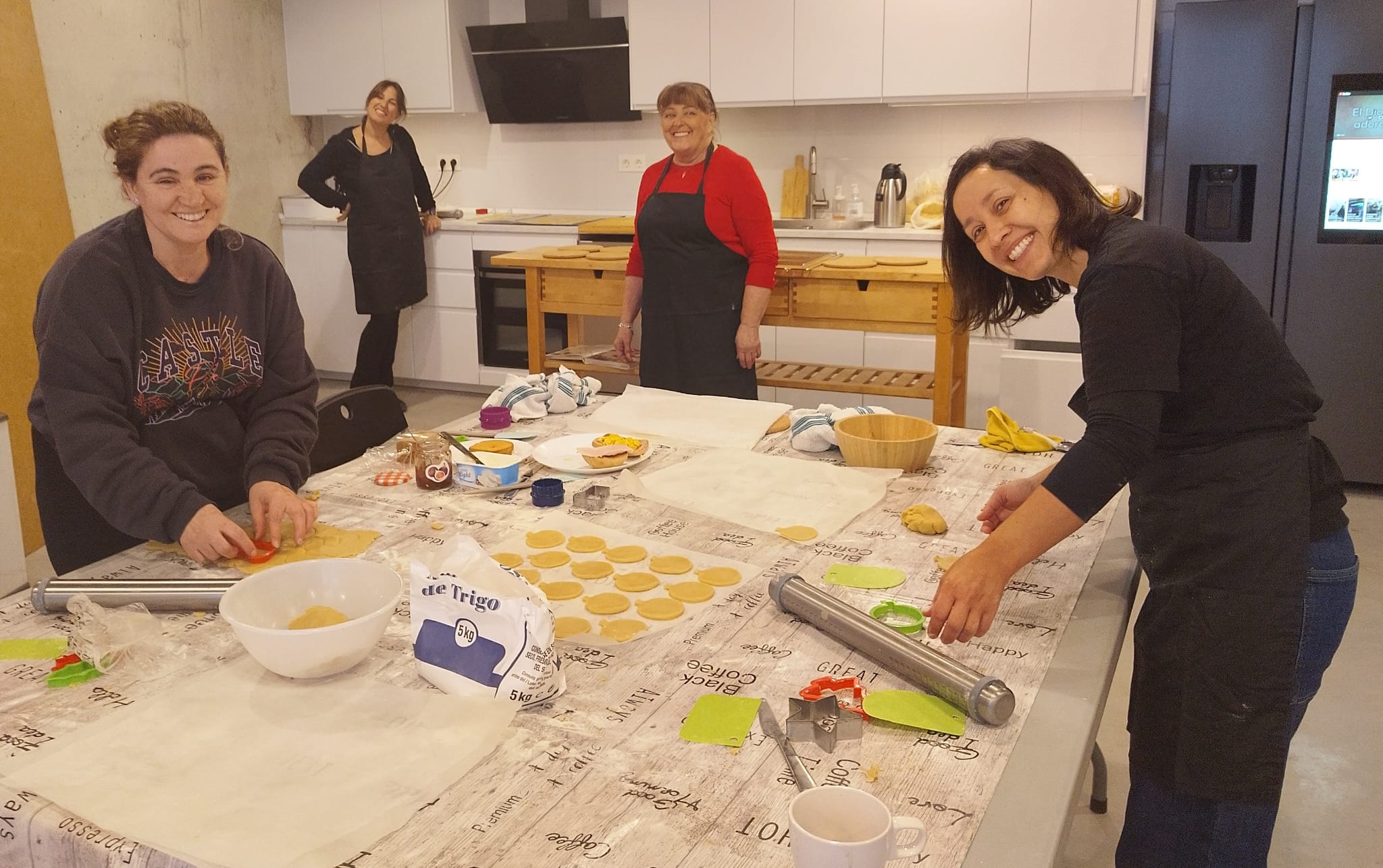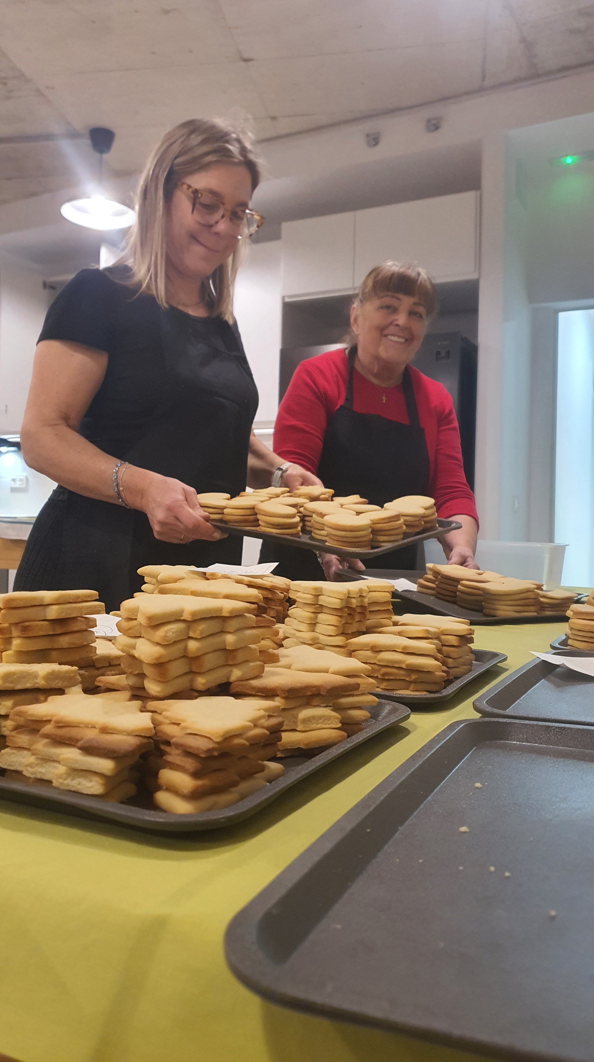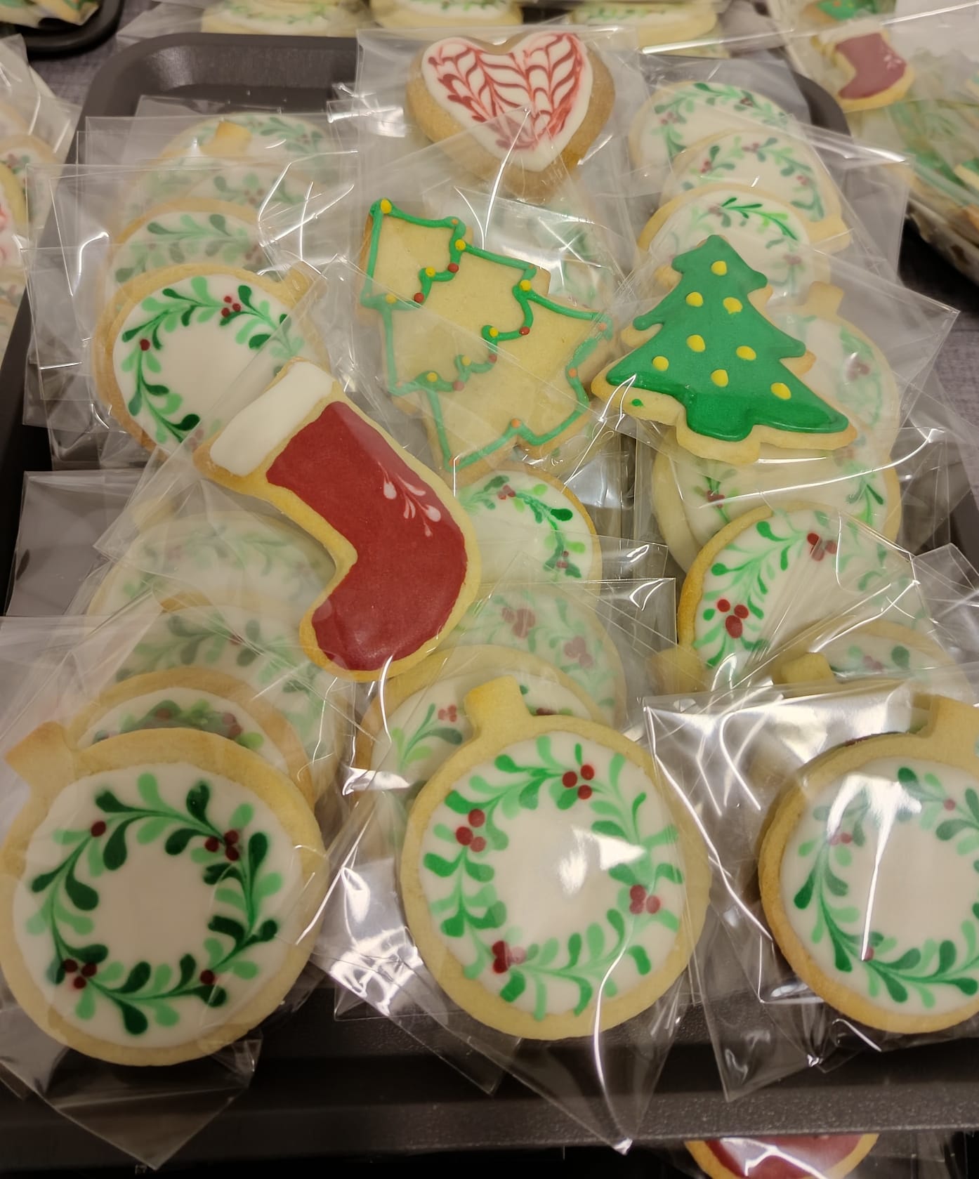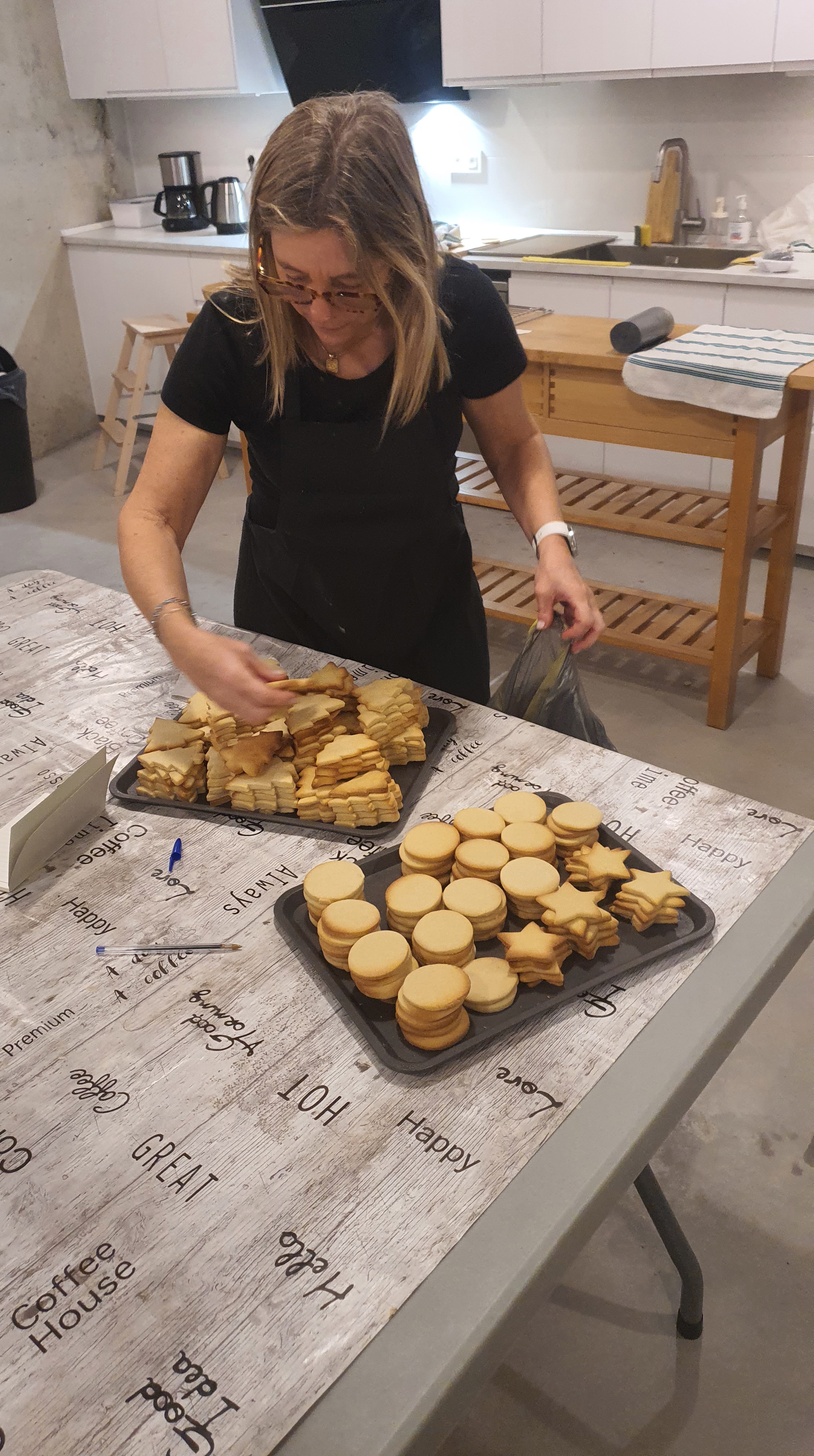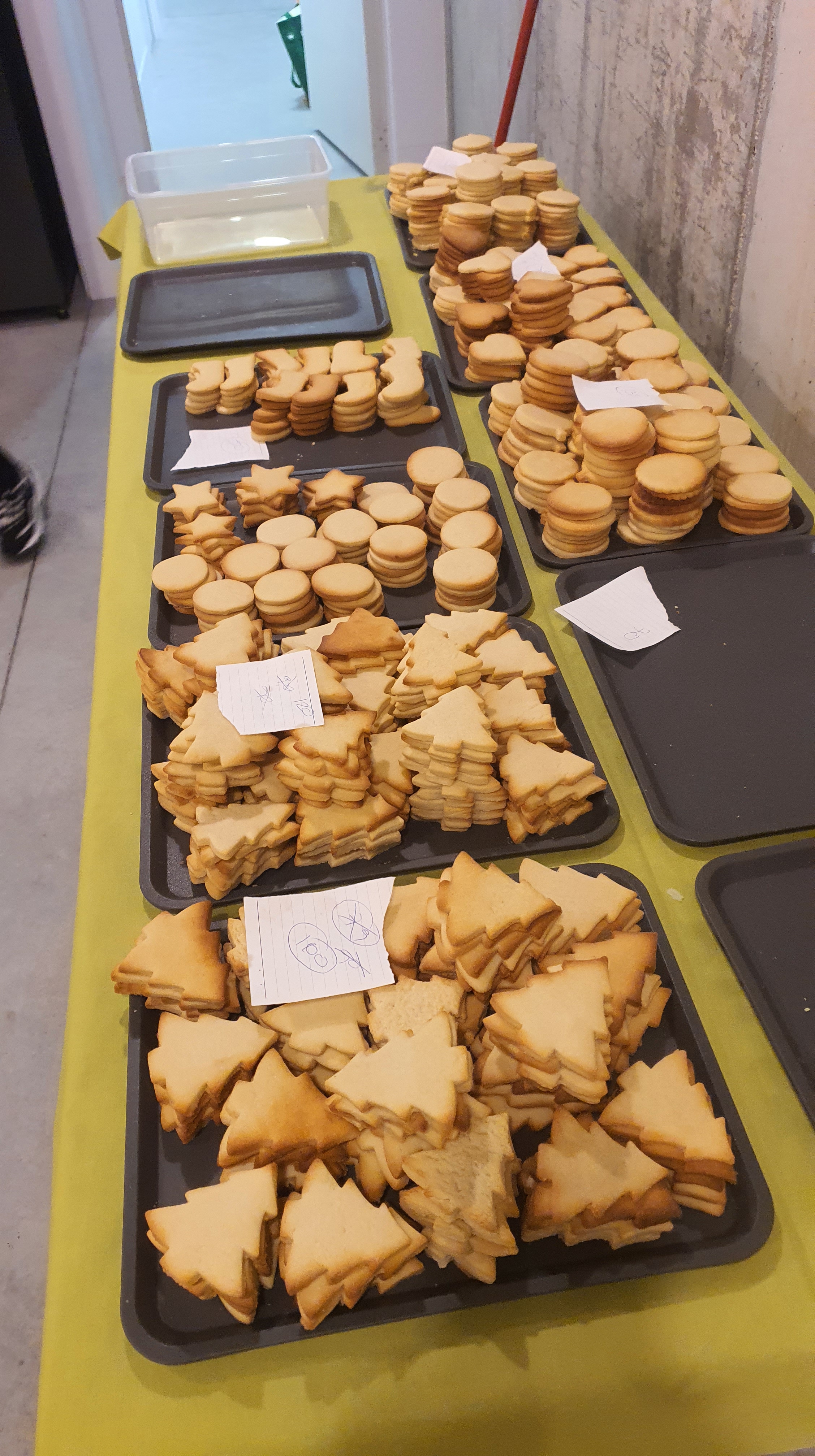 Entre el 4 y el 11 de diciembre varias personas se organizaron para primero comprar los ingredientes, luego preparar, dar forma y hornear la masa durante varias horas de más de un día. Las mangas y la decoración se hicieron presentes en una amena tarde de domingo después de la celebración, continuando al otro día. Más tarde se realizó el envasado en bolsas individuales de celofán, y se diseñó e imprimió la postal que acompañaría a las galletas. En ellas, además de la presentación y los buenos deseos, se indicaban los ingredientes de nuestras galletas artesanas para evitar problemas con las alergias: harina, mantequilla, huevo, azúcar, esencia de vainilla y colorantes alimenticios.