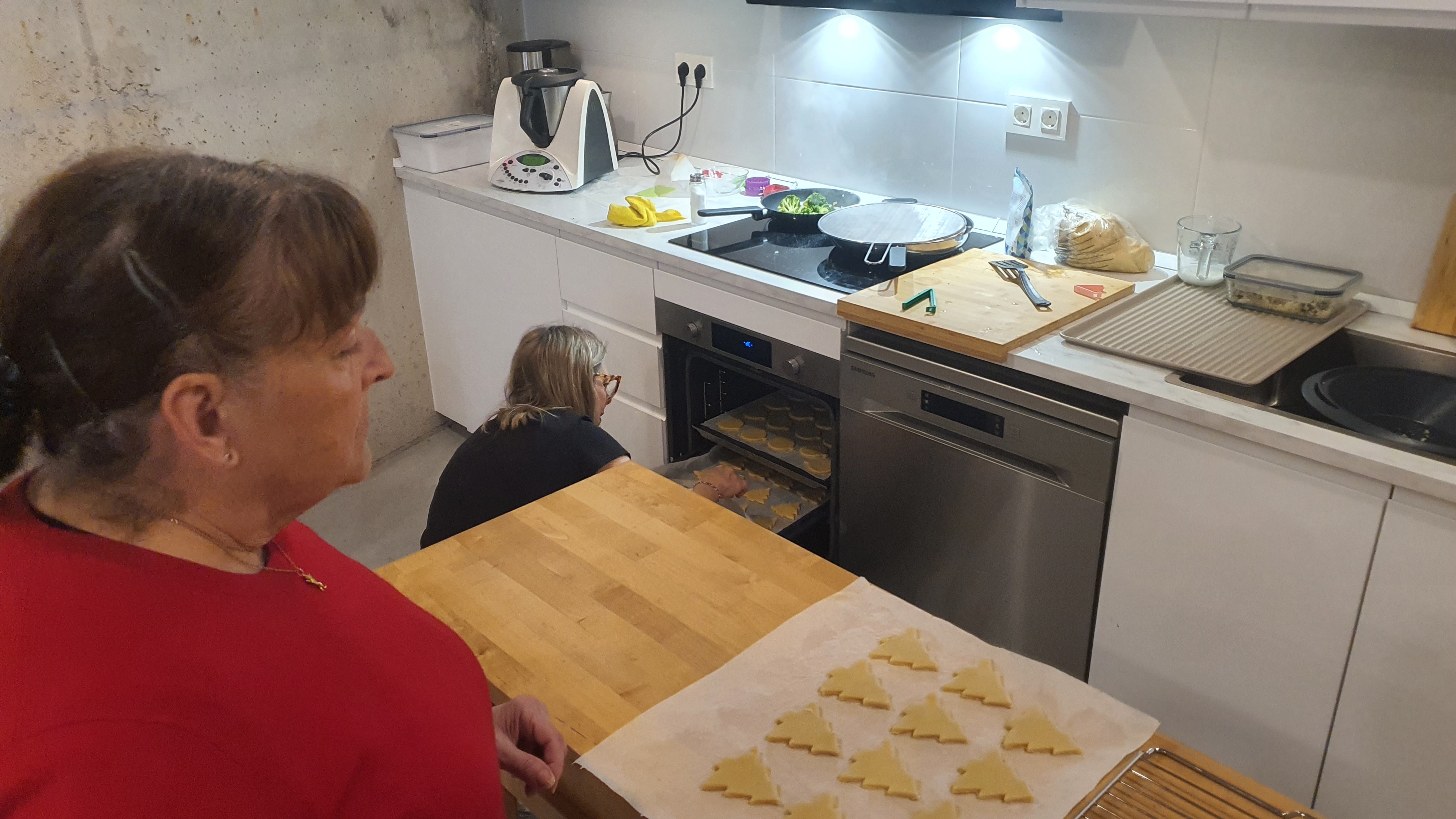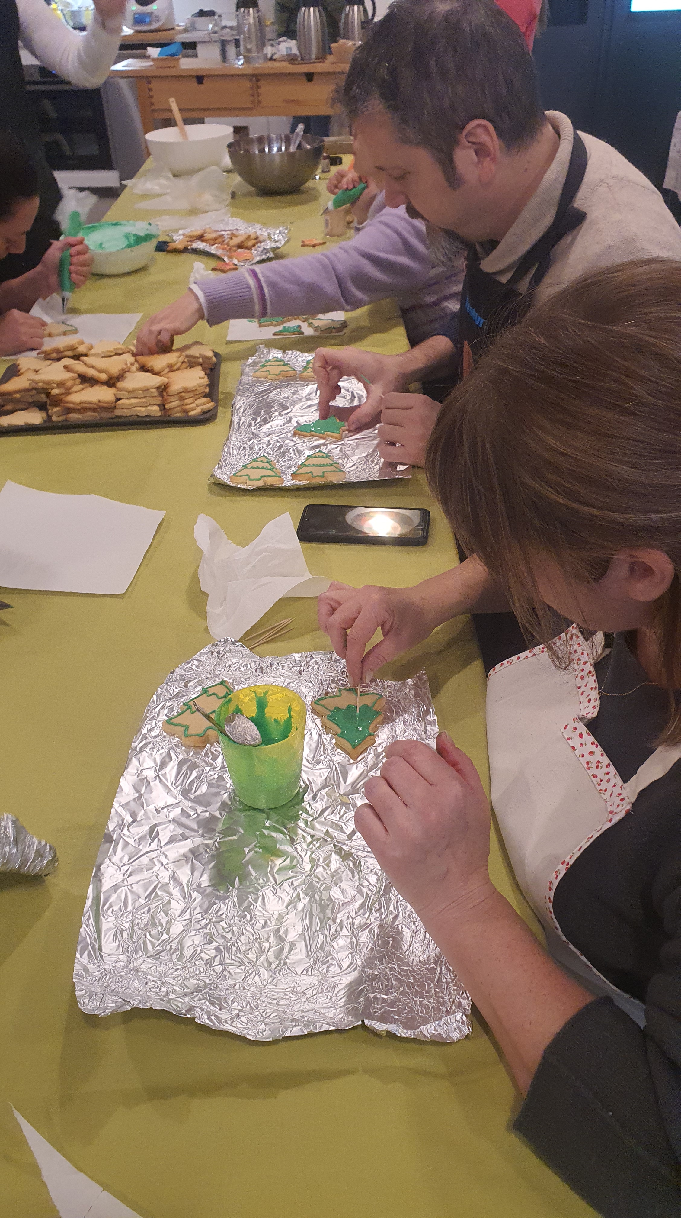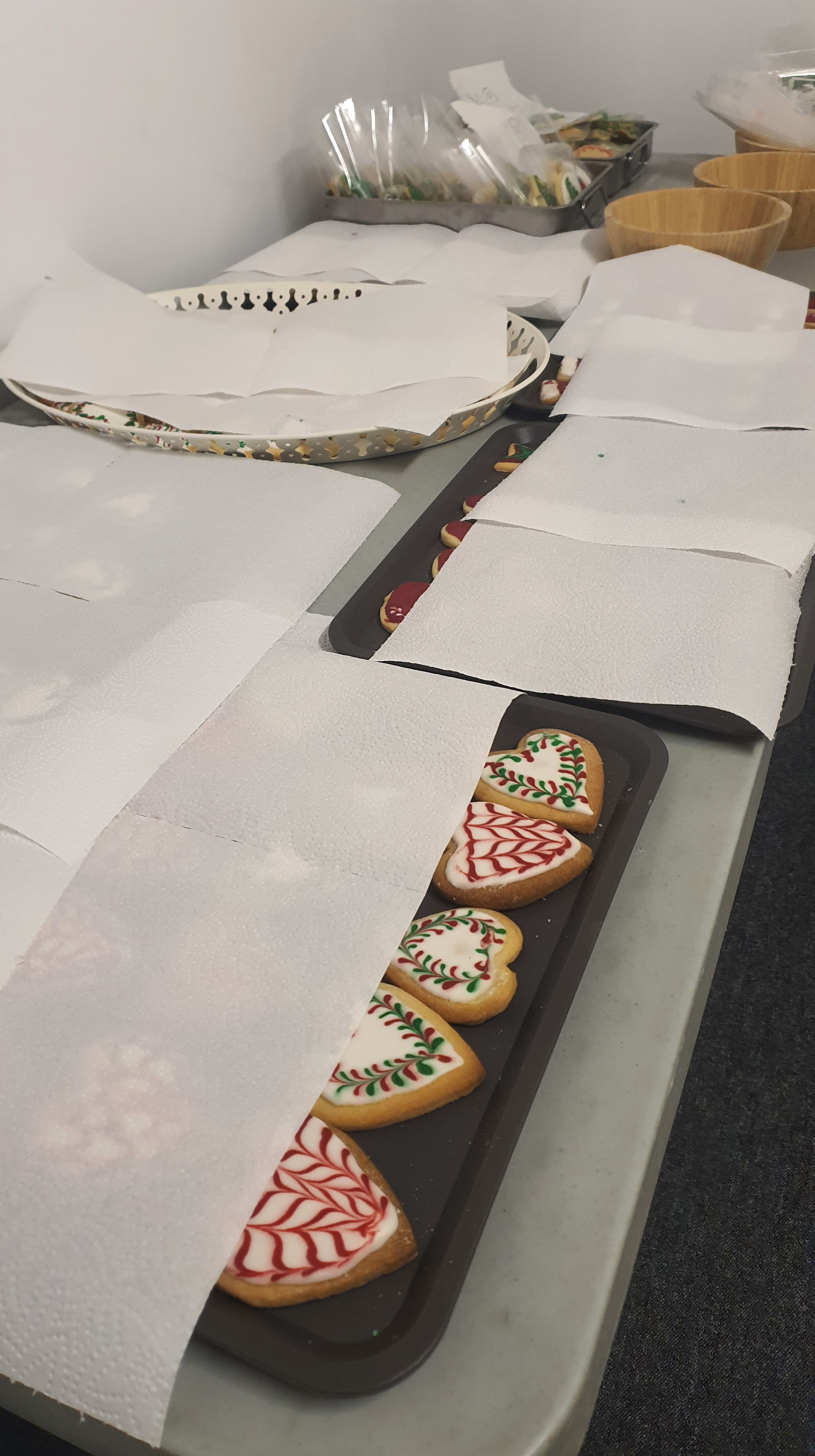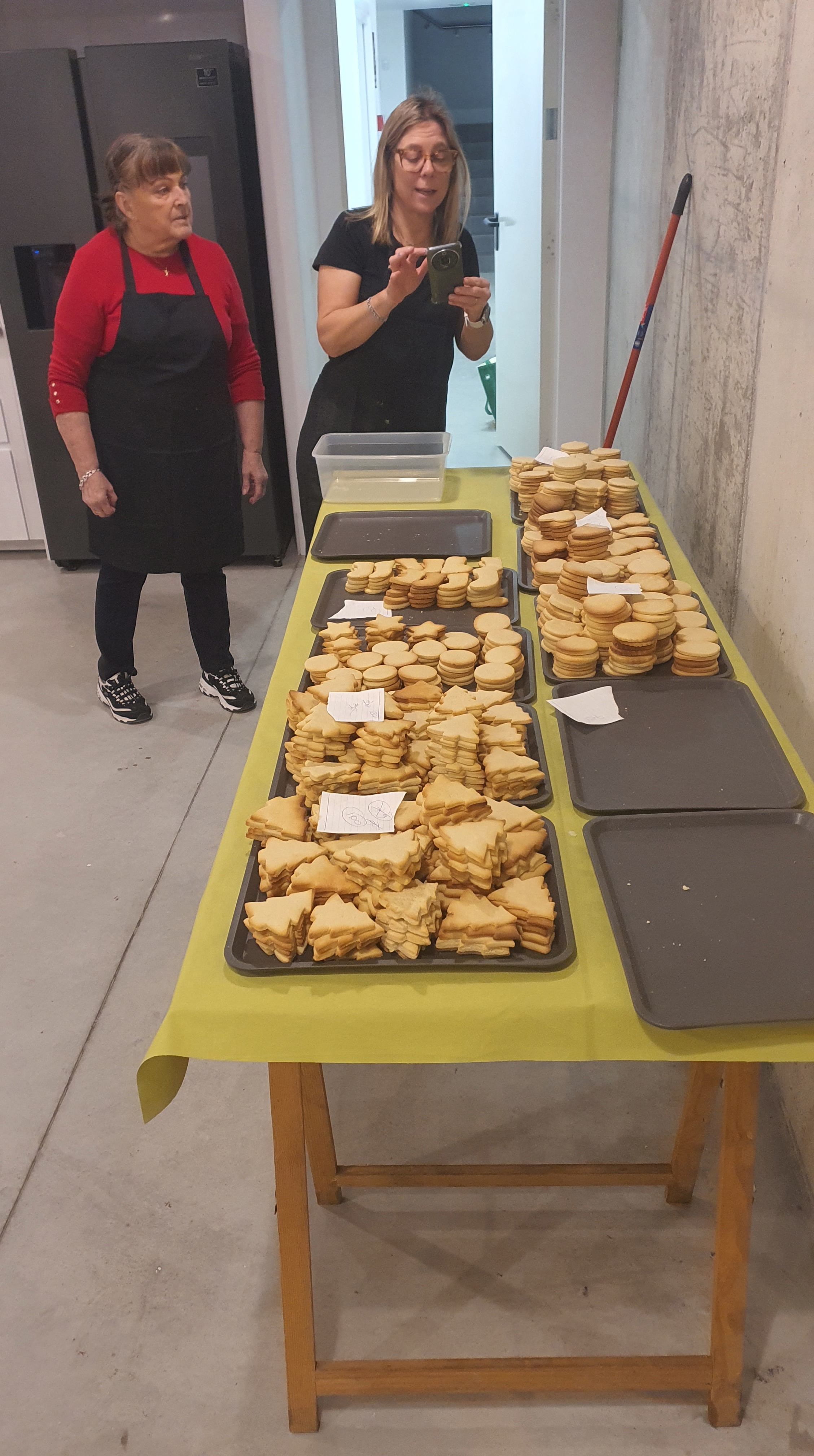 Entre el 4 y el 11 de diciembre varias personas se organizaron para primero comprar los ingredientes, luego preparar, dar forma y hornear la masa durante varias horas de más de un día. Las mangas y la decoración se hicieron presentes en una amena tarde de domingo después de la celebración, continuando al otro día. Más tarde se realizó el envasado en bolsas individuales de celofán, y se diseñó e imprimió la postal que acompañaría a las galletas. En ellas, además de la presentación y los buenos deseos, se indicaban los ingredientes de nuestras galletas artesanas para evitar problemas con las alergias: harina, mantequilla, huevo, azúcar, esencia de vainilla y colorantes alimenticios.