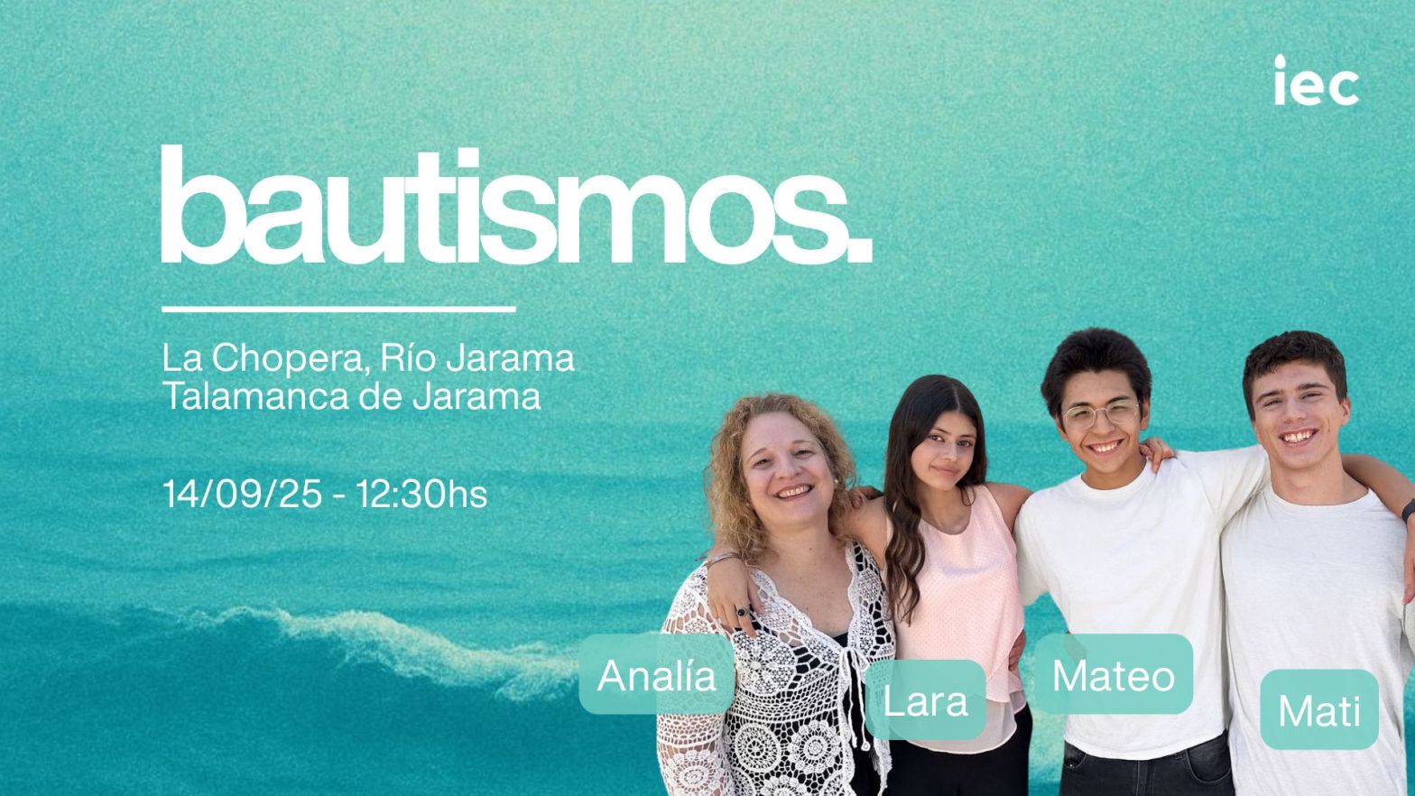 El domingo 14 de septiembre nos vamos a celebrar una de las cosas que más nos gustan. Cuatro personas han decidido obedecer a Dios en sus vidas a través de Jesús ¡y se lo dirán a todos mediante su bautismo en el río Jarama! Comenzamos puntualmente a las 12:30h. Luego de la celebración nos quedamosSigue leyendo «Bautismos»